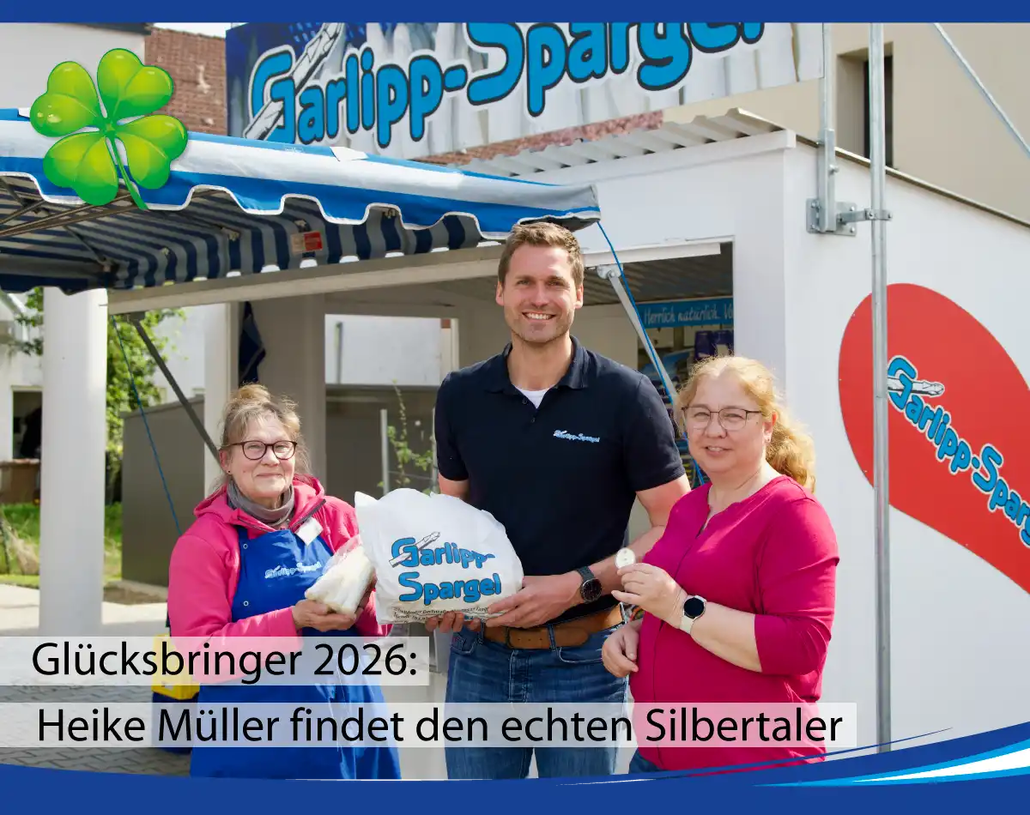 Seehausen, 17. April 2026 – Bei sonnigem Frühlingswetter wurde am Garlipp-Spargel-Verkaufsstand in Seehausen der erste Glücksbringer des Jahres 2026 verlost. Frau Heike Müller hat den echten Silbertaler im geschälten Garlipp-Spargel gefunden.