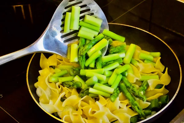Schaumkelle aus dem Wasser heben und beiseitestellen. Das Spargelwasser aufheben. - Nudeln kochen: Im gleichen Spargelwasser (bei Bedarf noch etwas Salz hinzufügen) die Kelch-Nudeln nach Packungsanweisung