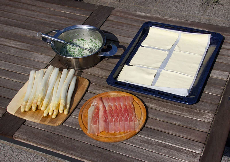 - Den Blätterteig in 6 gleich große Rechtecke schneiden und auf ein Backblech legen. Nun jeweils 2 Stangen des gekochten Spargels