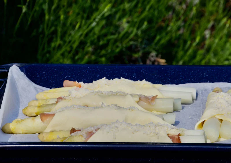 - Den geschälten Spargel ca. 5 Minuten in Salzwasser kochen.